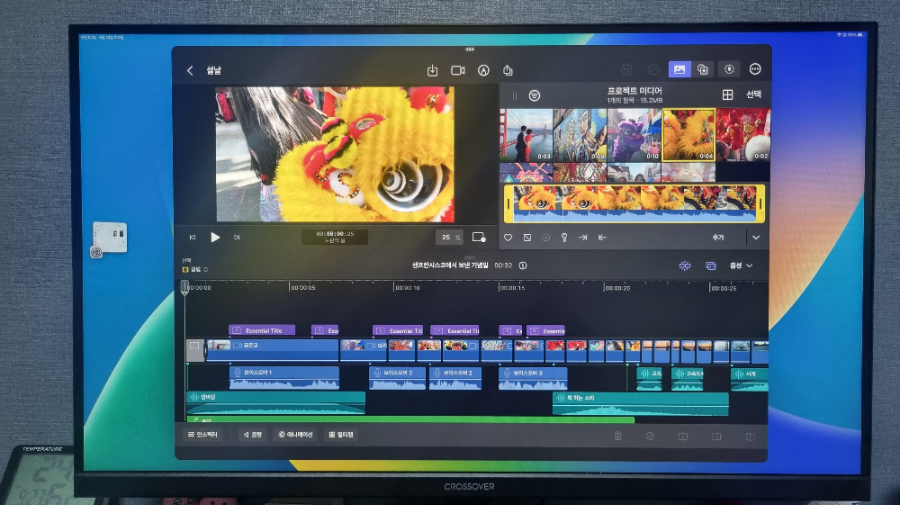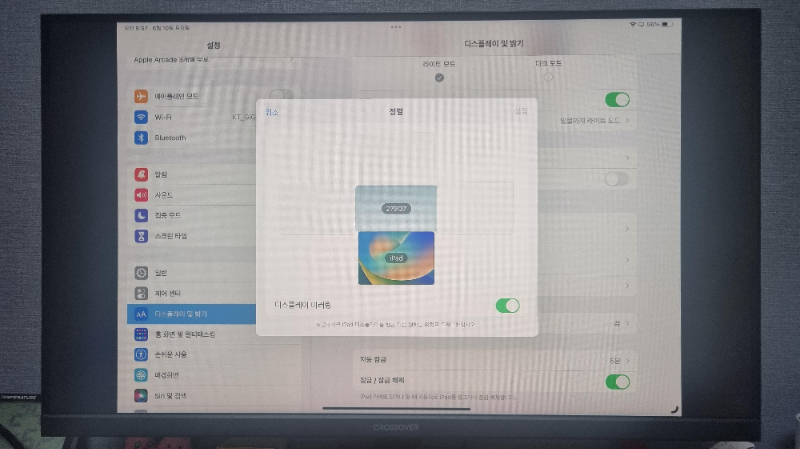미러링모드시 16:9 모니터와 화면크기가 다르기에 모니터 좌우측면이 잘리게 나옵니다. 즉 아이패드 화면비율대로 나옵니다.