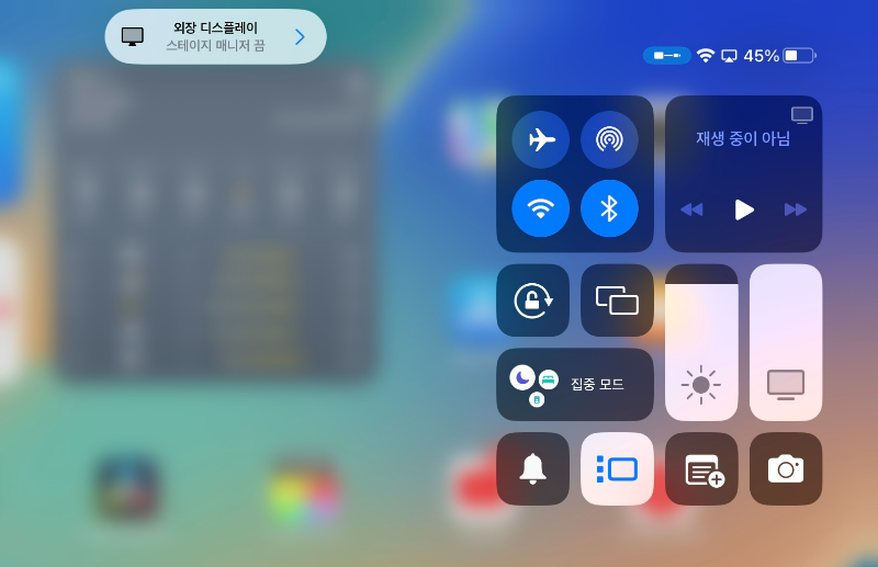 스테이지매니저는 아이패드 오른쪽 위화면을 아래로 쓸어내리면 설정이 나옵니다. 점 세 개가 있는 모니터 모양의 버튼으로 켜고, 케이블이 연결되면 화면 상단에 모니터 연결 표시가 나옵니다.