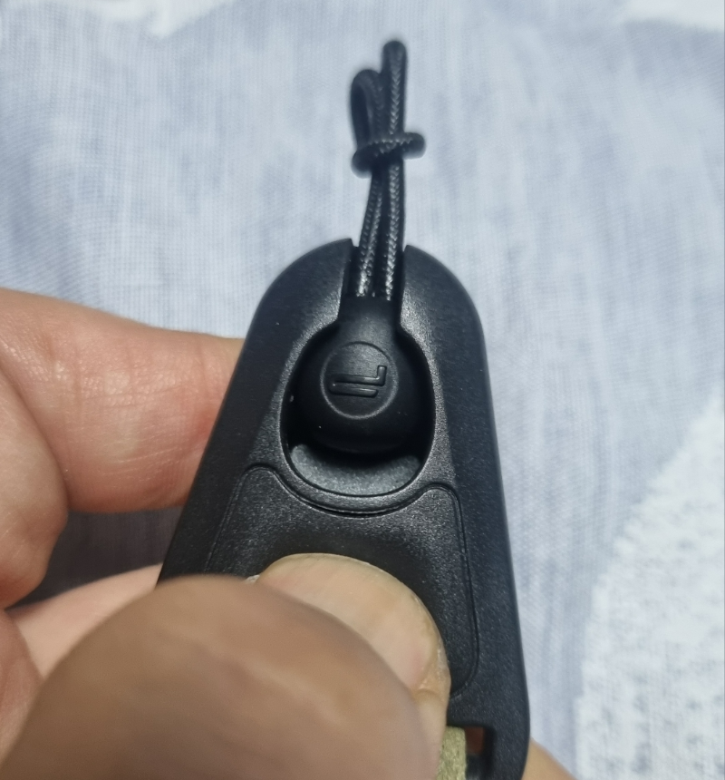 버튼을 누르면 사진처럼 끈 끝 부분의 체결봉이 나올 수 있게 공간이 나오는데요. 그냥 쉽게 빠집니다.