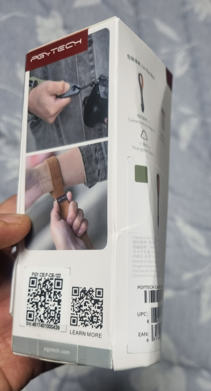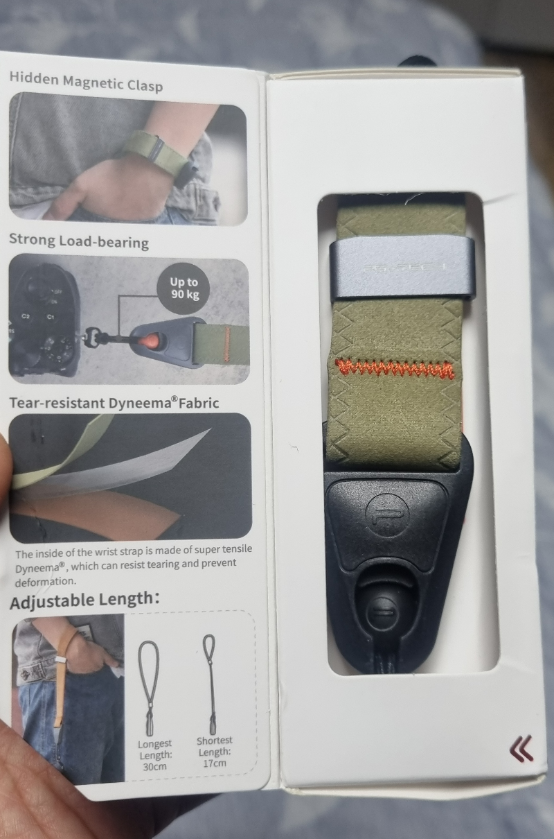전면에 이중커버 박스인데요 열면 스트랩 설명과 제품이 잘 보이게 넣어져 있어요. 왼편 설명인쇄에도 나오지만 카메라와 스트랩 연결끈의 최대하중 90kg 이상 버틴다고 나옵니다. 끈이 매우 얇은데요 약간 의심이 들기는 합니다.