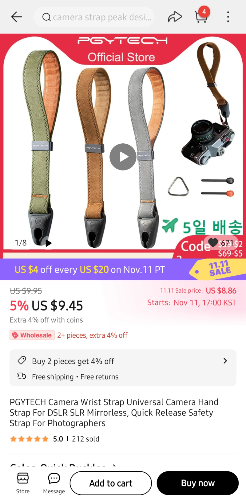 위 첨부 사진 보면 9.45달러라고 나오지만 연결고리만일 경우이고 스트랩까지 전체 구매 시 저의 경우 28.45달러에 구입했습니다. 국내 정발가가 대략 44-45천 원 정도 하니 약 4-5천 원 정도 저렴합니다. 알리익스프레스 판매점도 PGYTECH 공식몰이 있어 거기서 구입 시 5일 안에 한국 배송되니 뭐 손해 볼일은 없네요.