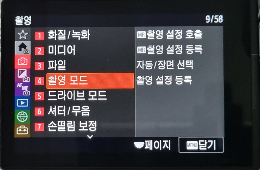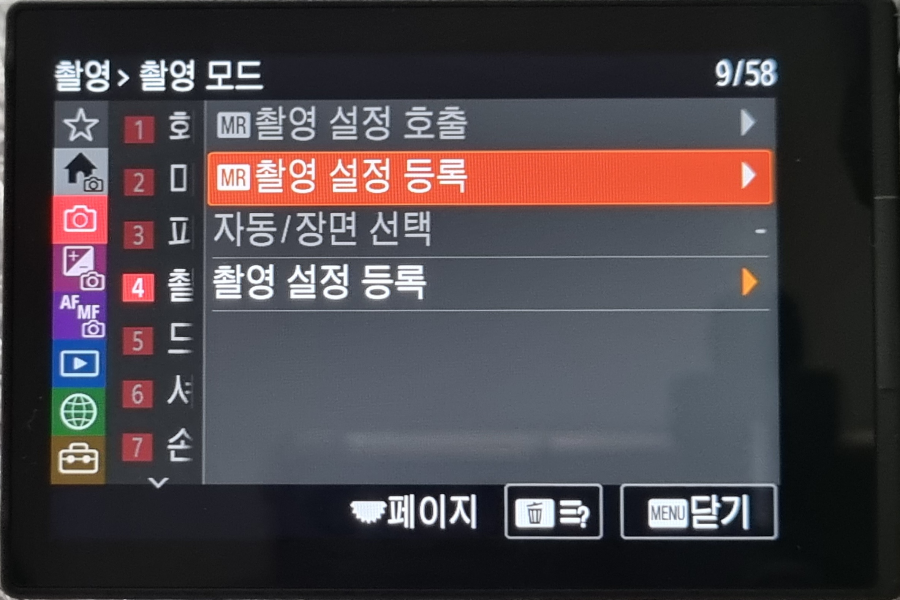 붉은색 커서를 다시 맨 왼쪽 메뉴바로 휠다이얼을 이용 이동을 한 후 '비디오'모양에 위치합니다. 이 항목의 하부메뉴인 4번 '촬영모드'에 위치하면 메뉴가 보이는데 'MR촬영 설정 등록'이 항목으로 들어갑니다.