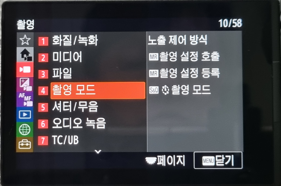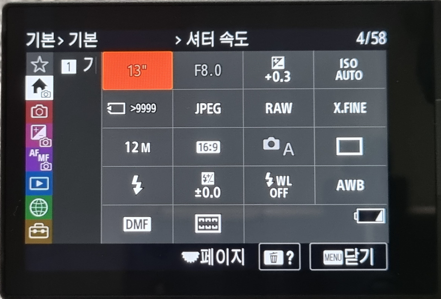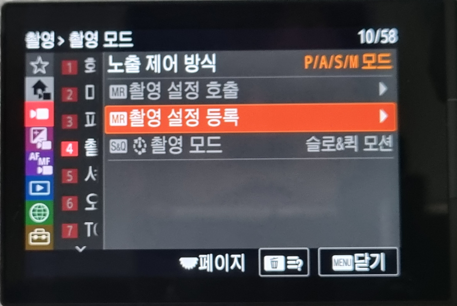 위 사진처럼 다양한 조건을 항목마다 설정이 가능합니다. 설정이 완료되면 동영상의 경우처럼 맨 왼쪽 메뉴바로 휠다이얼을 이용, 붉은색 커서를 이동시킵니다.