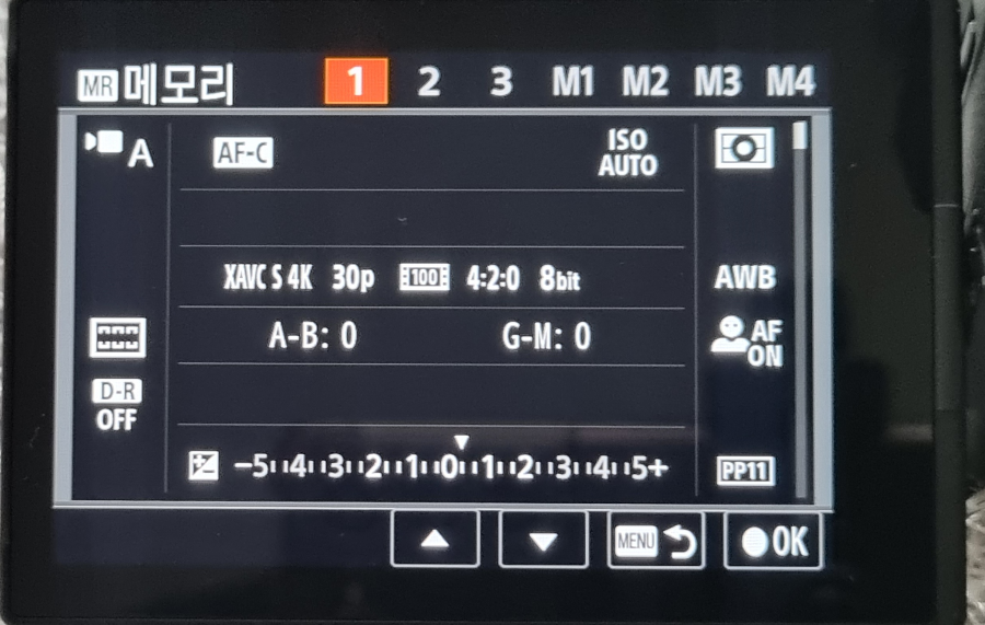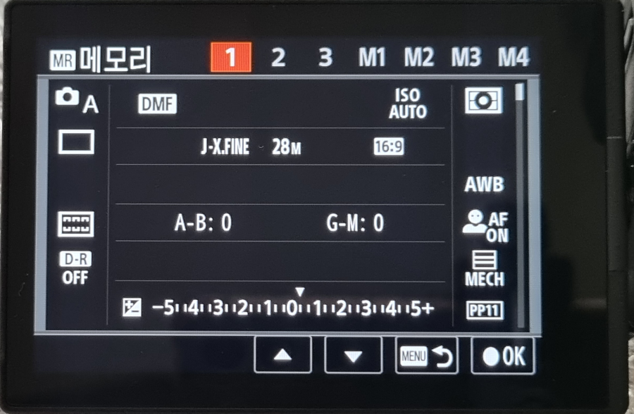 상단에 보면 1번부터 3번 그리고 M1부터 M4까지 총 7개의 저장소가 있는데 1~3번까지는 카메라에 저장되고, M1~M4는 메모리카드에 저장됩니다. 그래서 메모리카드가 바뀌면 M1~M4에 저장된 값은 불러올 수 없는 거죠.