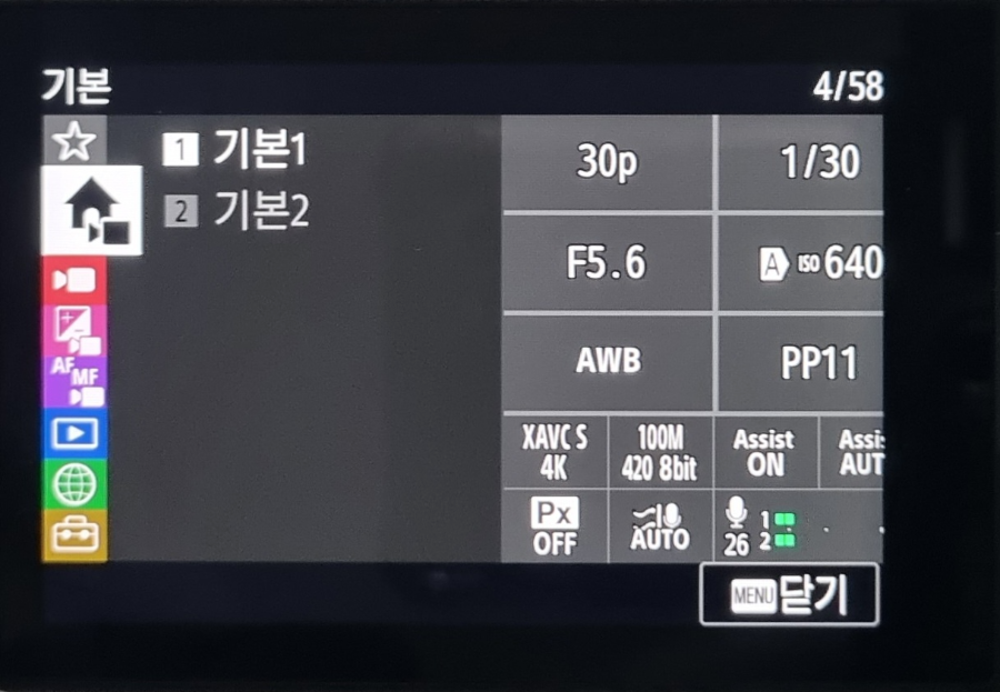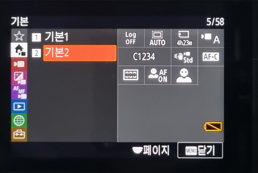동영상촬영 모드에 레버를 놓은 후 전면에 있는 'MENU'버튼을 누르고 붉은색 위치커서가 휠다이얼로 '집과 비디오'모양의 그림인 기본 모든에 위치하게 합니다. 그러면 아래 사진과 같이 '기본 1', '기본 2' 이렇게 표시됩니다.