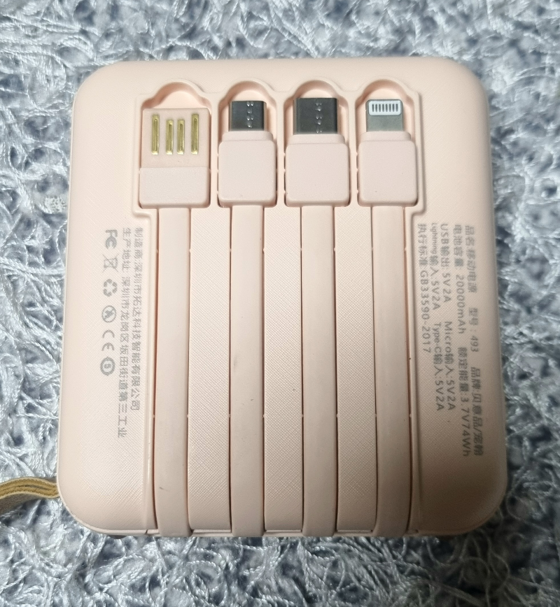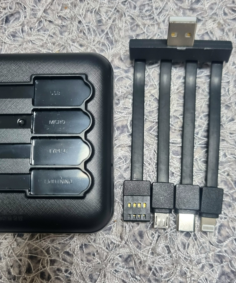 심플한 앞면과 달리 뒷면에 주렁주렁 선이 있어요. 애플용 라이트닝부터 5핀, USB-A, C type까지 4가지 잭이 있어 거의 별도의 케이블을 들고 다니지 않아도 거의 모든 기기 충전이 되네요. 충전출력은 4개 케이블 단자 모두 2A 입니다.