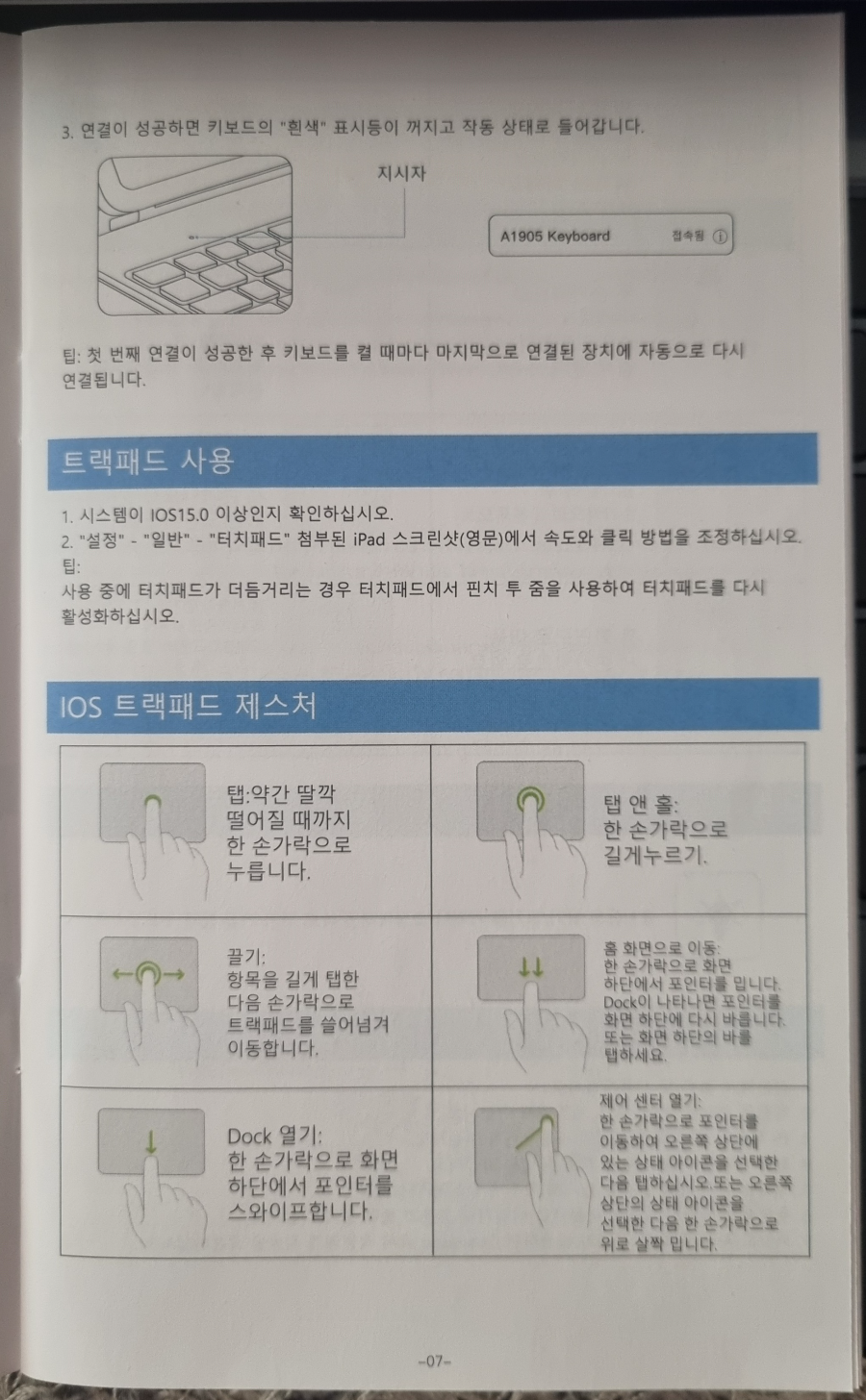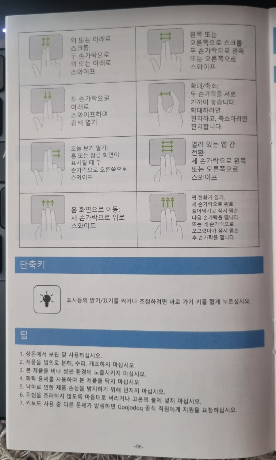 아래는 제스처기능에 대한 설명입니다. 설명서는 이 제스처 기능에 대해 중점적으로 보여줍니다.