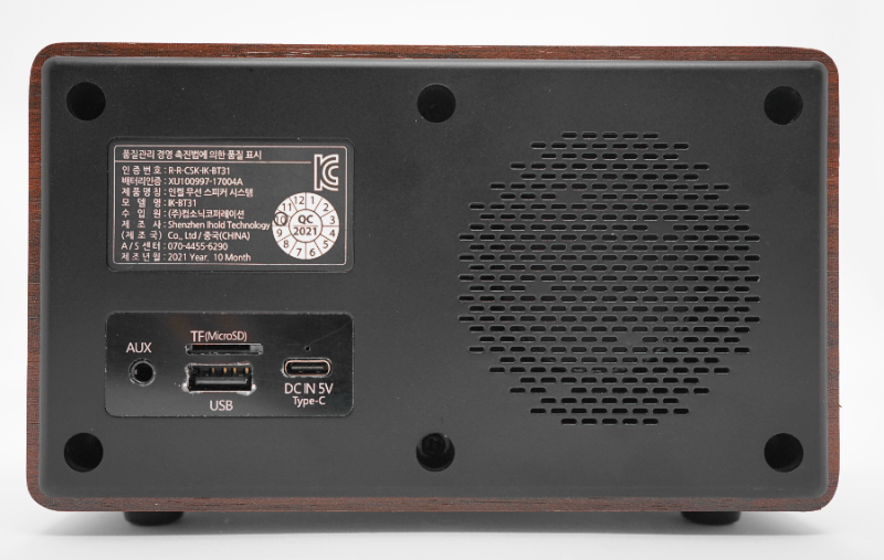 4. 연결부는 뒷면에 있습니다. AUX 단자, USB 포트, TF 슬롯, C-TYPE 충전단자가 있습니다.