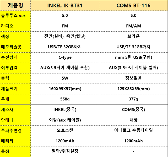 충전방식, 무게, AM수신 등 몇 개의 특징 외는 큰 차이는 없습니다.