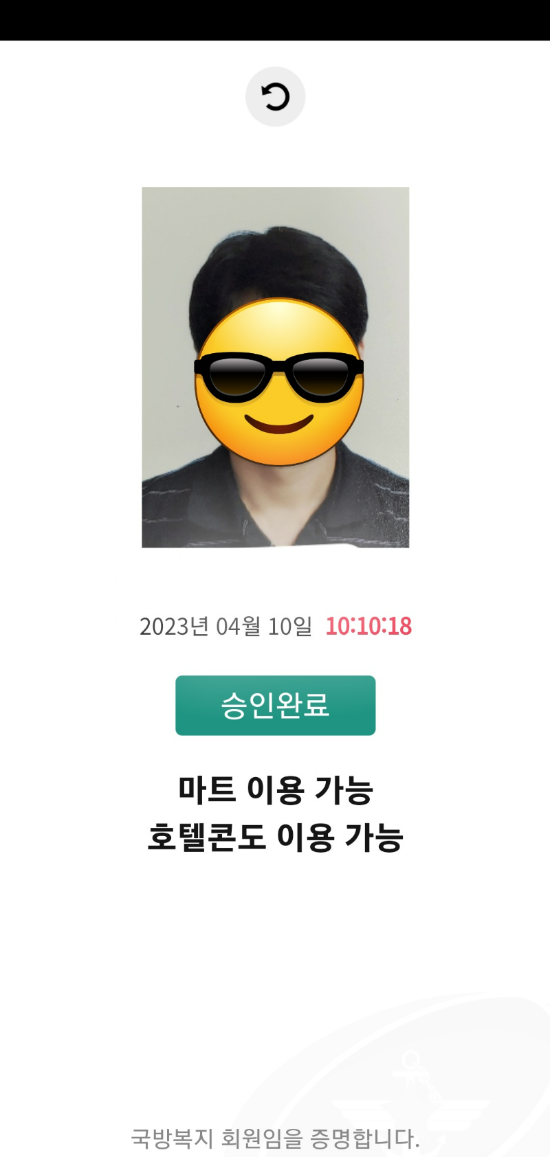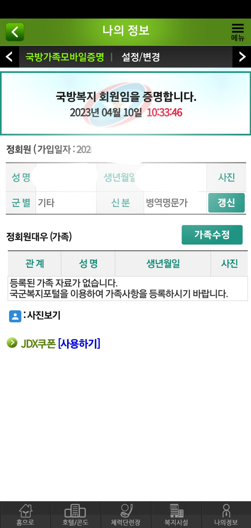 성명란 이름옆 사진아이콘을 누르면 아래 화면이 나오고 이 화면을 보여주면 군마트 출입이 실물 증 없이도 가능합니다. 단 병역명문가는 가족등록은 되지 않습니다.