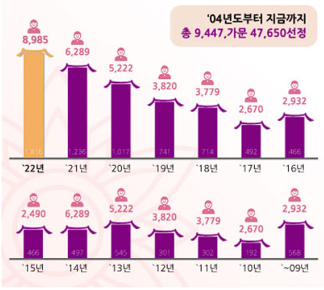 2004년부터 시행 현재 신청 집안 수로는 9,447 가문입니다. 의외로 적습니다.