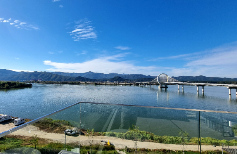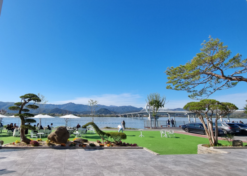 카페 앞에 강은 북한강입니다. 의암댐이 들어서 담수가 되어 의암호라고 부릅니다. 카페 1층부터 4층까지 어느 곳에 앉아도 의암호를 보실 수 있고, 춘천대교까지 있어 더욱 뷰가 좋네요.