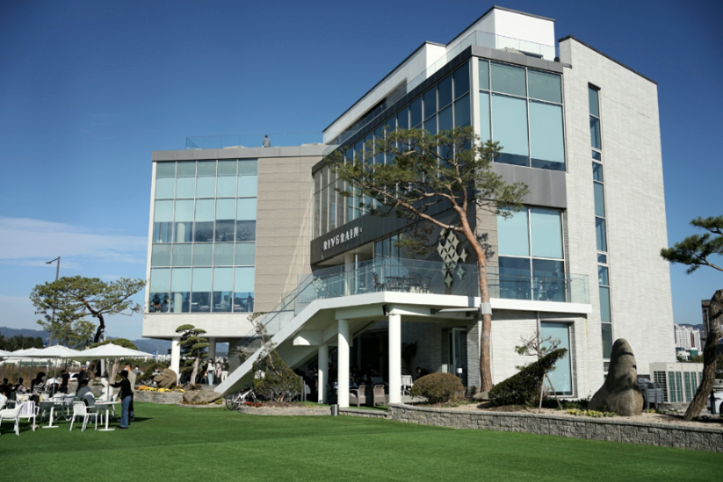 또한 건물 앞에 강한 녹색의 인조잔디가 있어 눈에 시원함을 주는데, 마치 리조트 건물 앞 같은 느낌을 줍니다.