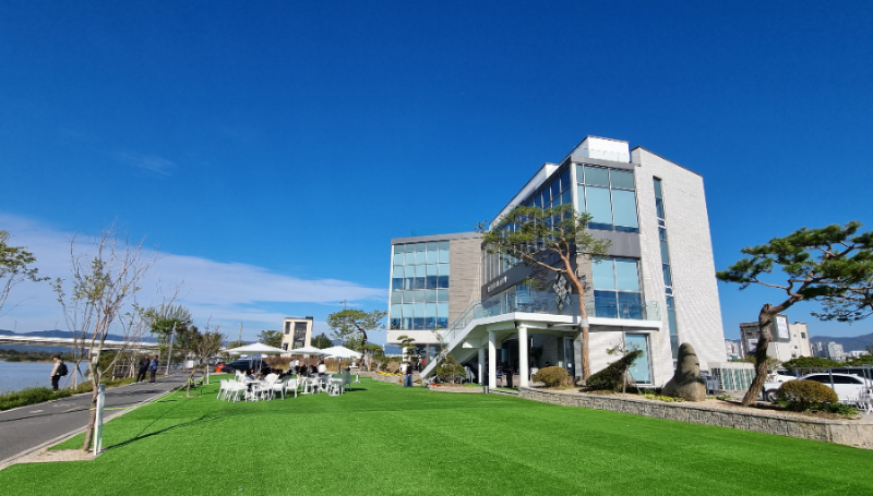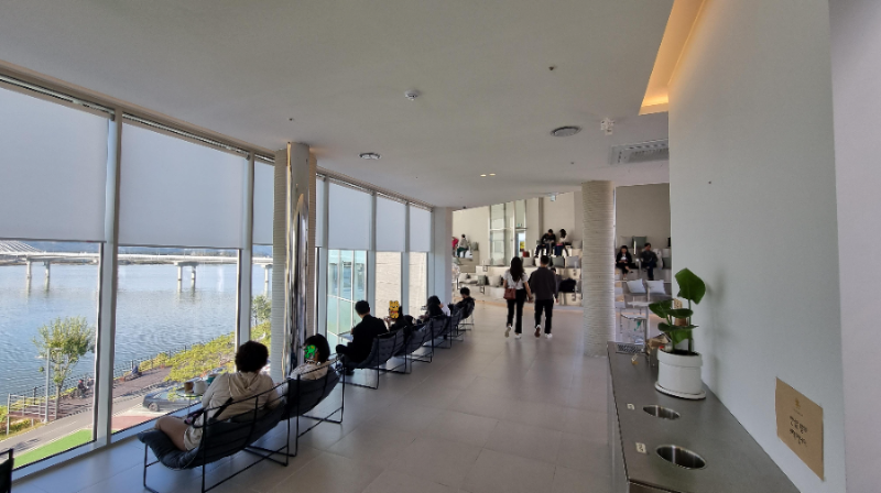 이곳 야외 잔디에도 테이블이 설치되어 강을 바라보며 음료를 즐기시는 분들이 많네요.
