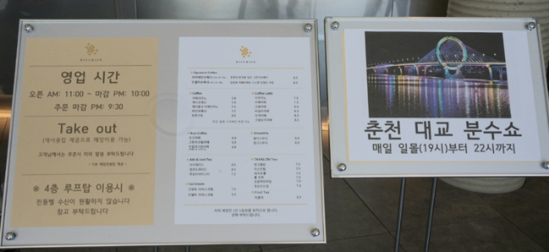 출입구에 춘천대교 분수쇼 홍보안내가 있어요. 분수쇼는 매일 저녁 7시부터 10시까지 한다고 합니다.