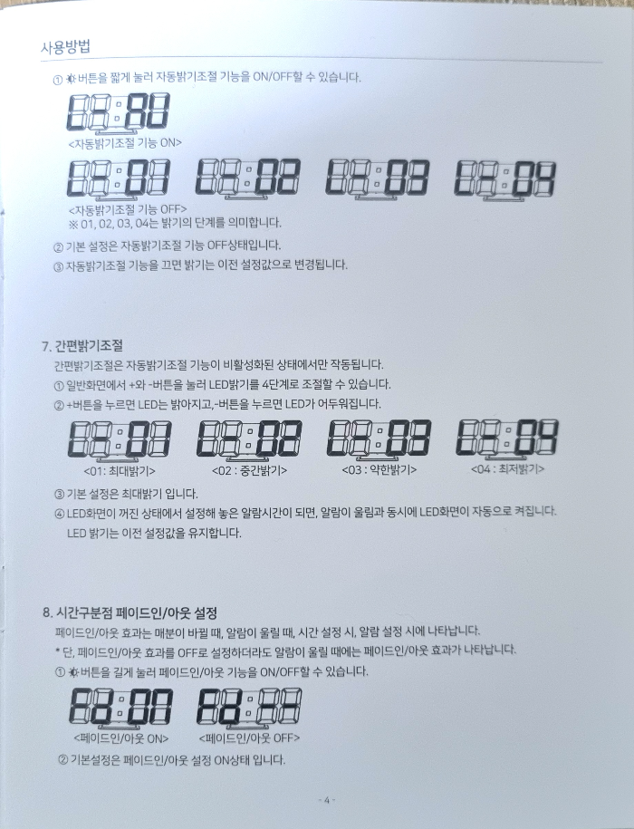 led밝기는 1-4단계와 자동이 있어요. 1이 젤 밝습니다. 너무 밝아서 밤에 불 끄면 아주 훤합니다. 잠을 방해할 정도로요. 자동으로 놓으면 센서에 의해 밝기가 자동 조정되니 자동으로 하세요. 그래야 매번 조정하는 번거로움이 없습니다.