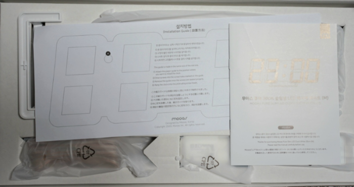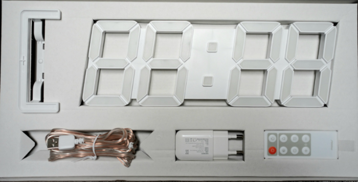 LED 시계, USB 전원 충전기 및 선, 리모컨, 받침대입니다. 벽걸이용 못 또는 나사못은 들어 있지 않아요. 개인적으로는 벽면 걸이용 나사못이 들어 있었으면 합니다. 전원선은 무척 길이가 깁니다. 약 5m 정도입니다.