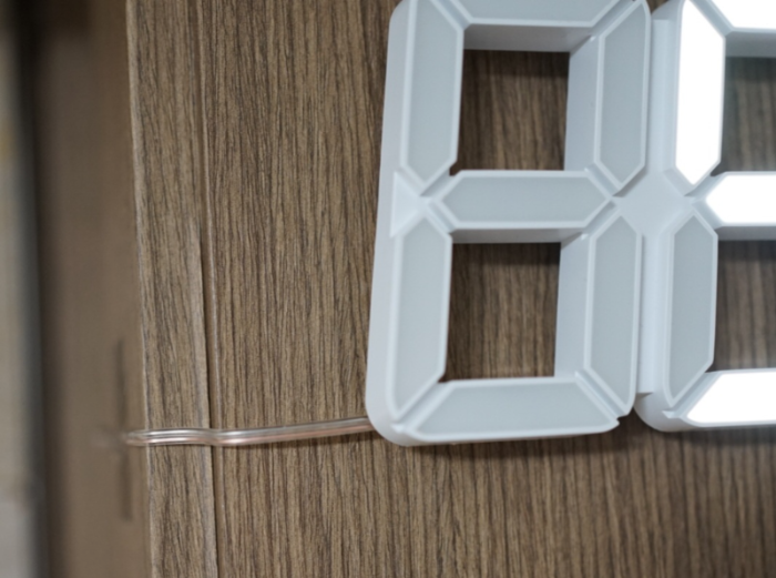 LED 시계 뒷면입니다. 좌우로 못걸이 홈이 있고 가운데 아래에 전원 연결선 단자가 있습니다.
