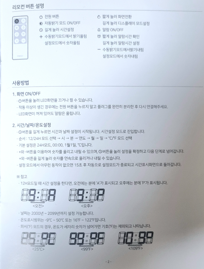 리모컨으로 시간 설정, 전원 켜고 끄기, 알람, 밝기 설정이 됩니다. 그래서 잃어버리면 안 될 듯합니다.