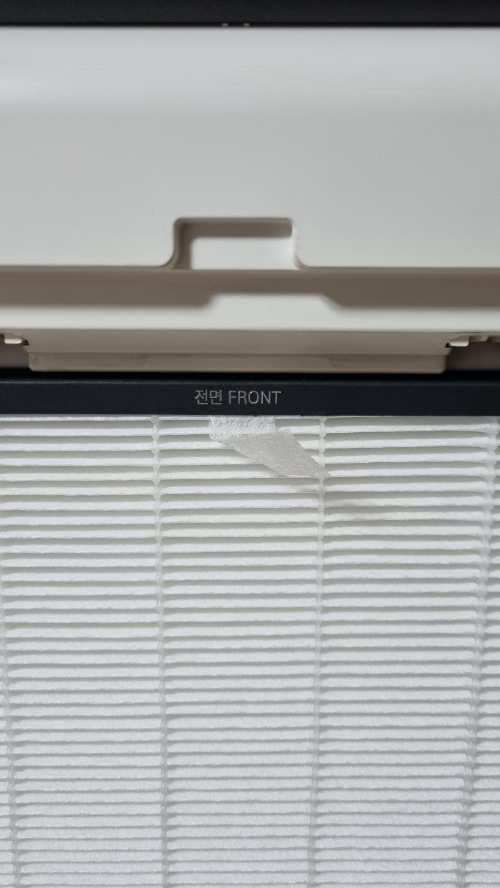 장착하는 순서는 마이크로필터-탈취 필터-프리필터 순으로 하시면 되는데 제가 산 제품은 프리필터 끝면에 양면테이프가 붙어 있었어요. 하지만 이 테이프가 에러라 결국 스카치테이프로 이렇게 탈취 필터에 붙였습니다.