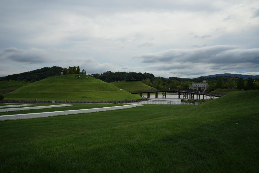 호수 주변 벤치에서 언덕을 보는 느낌과