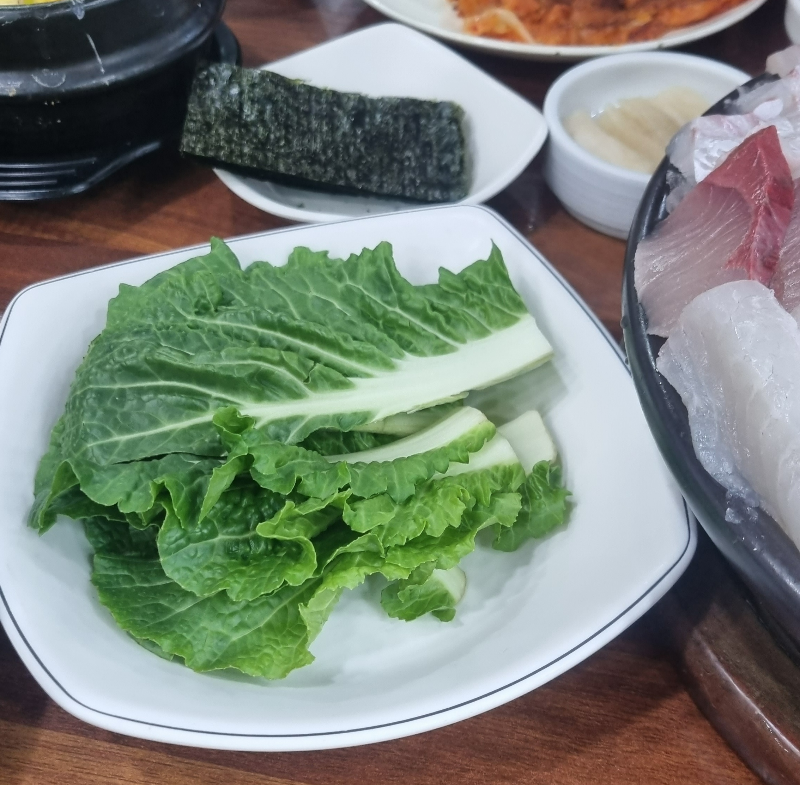 방어 때문에 양념간장과 묵은 백김치가 나옵니다. 방어에 늘 그렇듯이 김에 양념간장에 묵은지와 같이 먹으라고 합니다. 근데 뭔가 빠진 맛이 있는 듯한데 뭔지 잘 모르겠네요. 도미는 우럭과 맛의 별 차이를 못 느끼겠고.