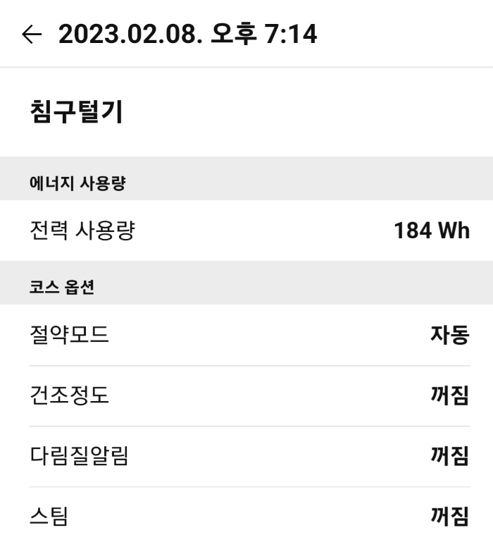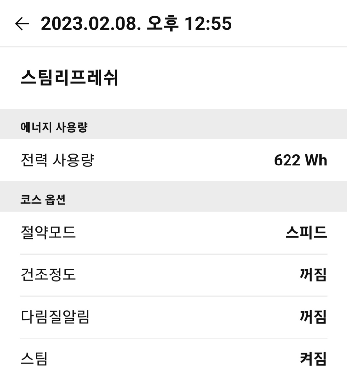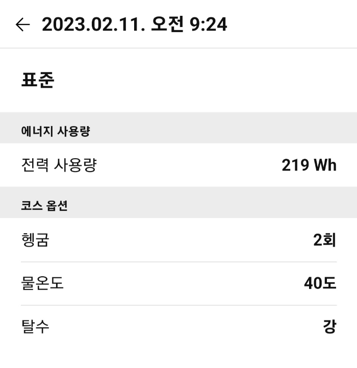 LG ThinQ 앱에 매 가동 때 얼마 정도의 전력량이 소모되는지 측정치가 나오는데 이번 세탁과 건조 과정에서 얼마 정도 전기가 들었는 확인 해 봤습니다. 물론 아주 정확한 수치는 아니지만 대략적 소모 수준을 판단할 수 있겠죠.