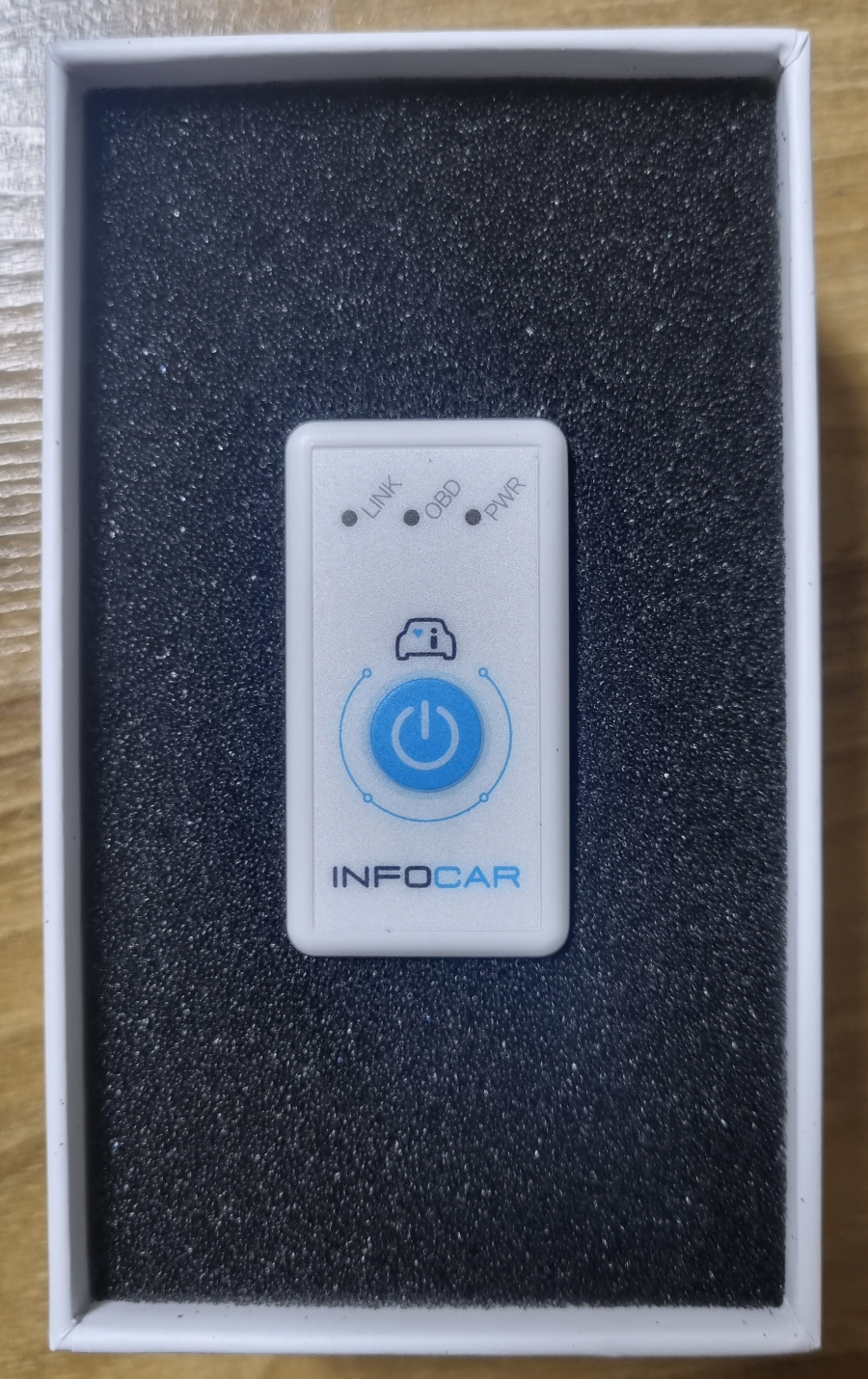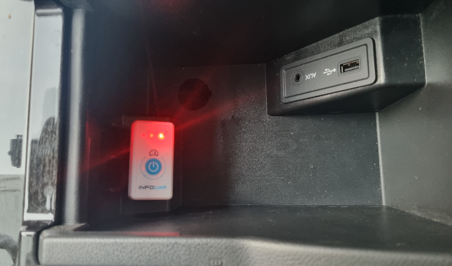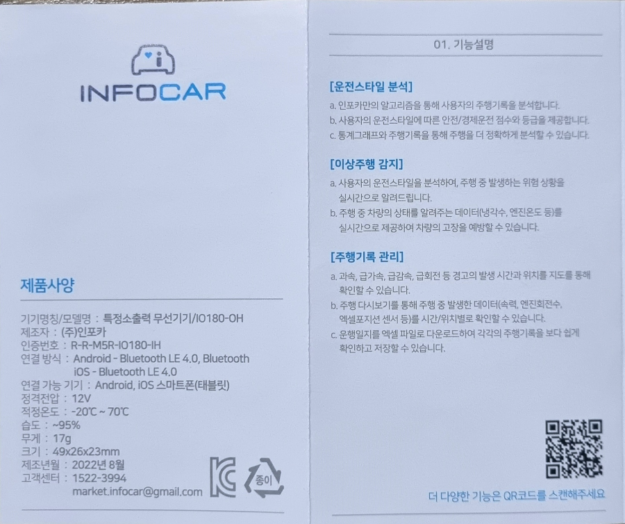 연결하면 사진처럼 붉은 등이 점등됩니다. 정보를 확인하기 위해서는 '인포카'라는 앱을 설치해야 합니다. 인포카 기기를 구매하면 별도의 비용 없이 앱을 이용할 수 있네요.