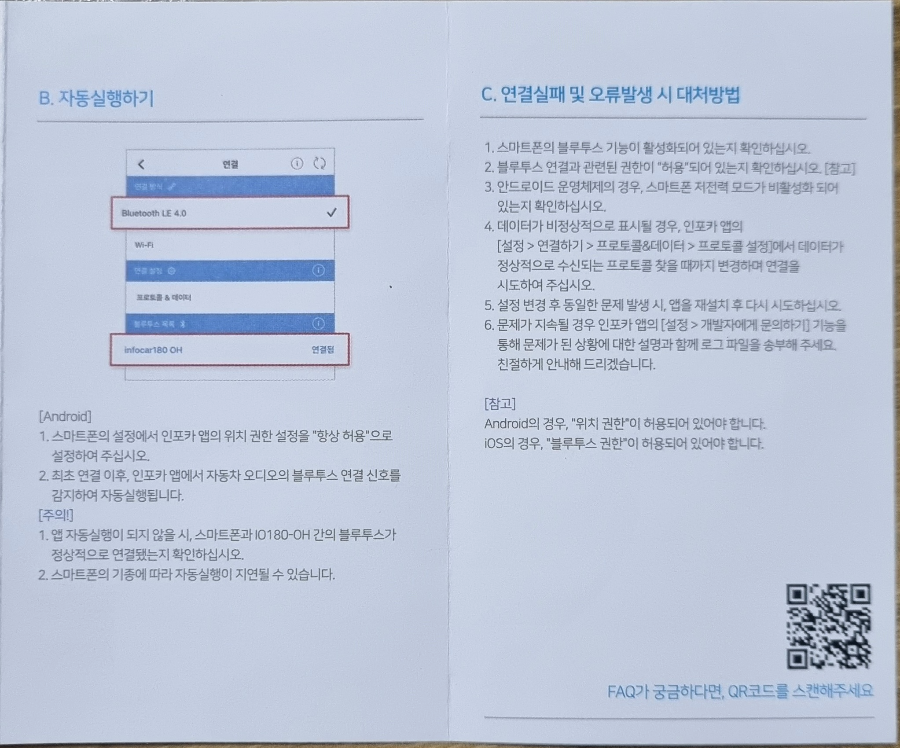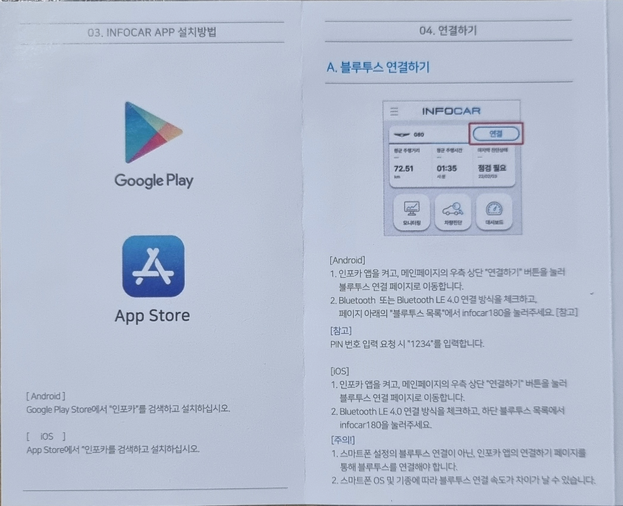 기기만 잘 설치가 되었다면 앱을 깔고 차량 등록 블루투스 연결등은 누구나 쉽게 할 정도로 간단합니다. 그냥 해도 되지만 정 어려우시면 설명서대로 하시면 쉽습니다.