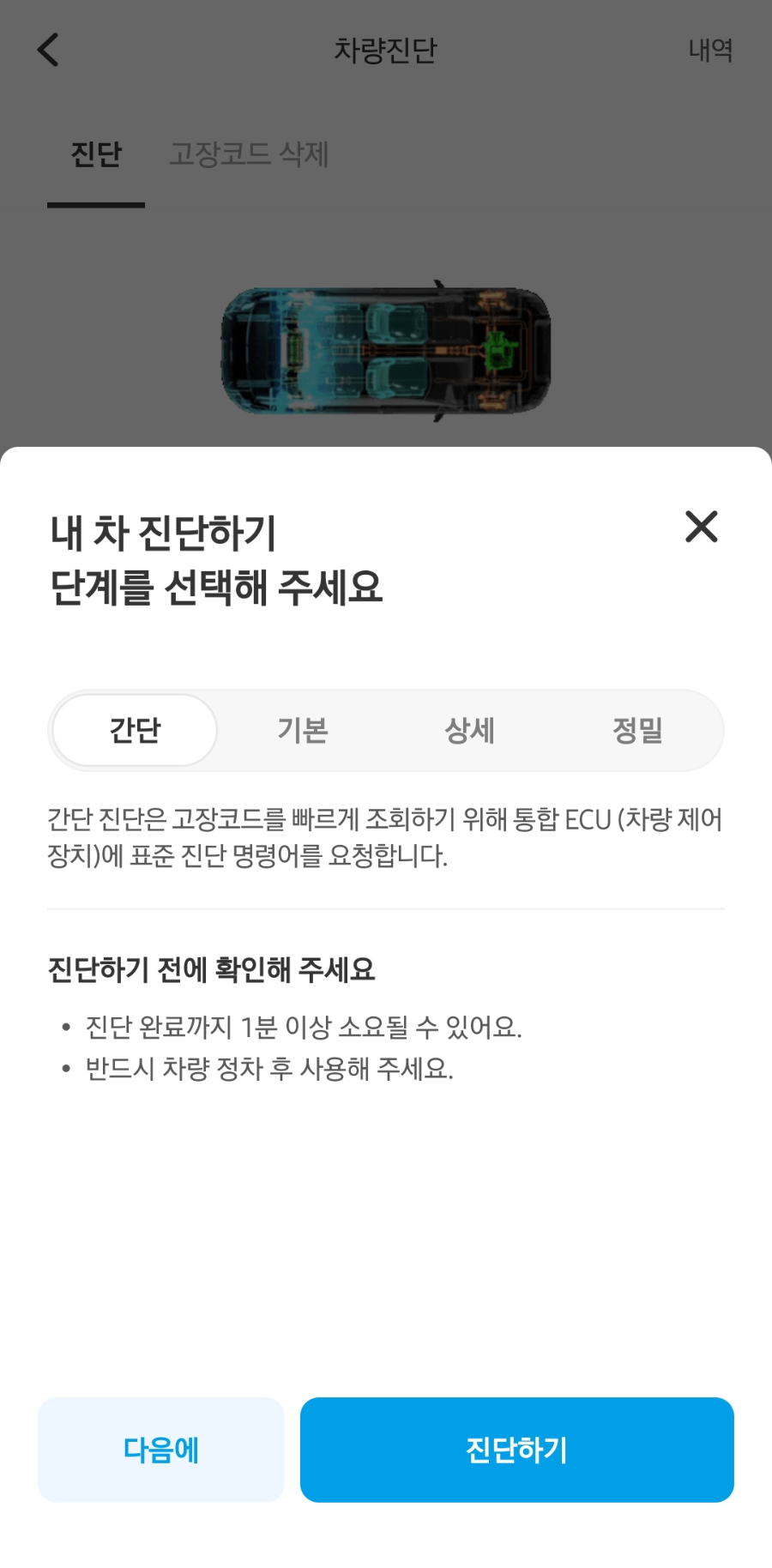 차량진단은 4가지 모드이며 원하는 모드마다 별도로 측정을 합니다. 진단하기 누르면 일정시간이 소요후 결과가 나옵니다. 정밀로 갈 수록 시간이 오래 걸립니다.