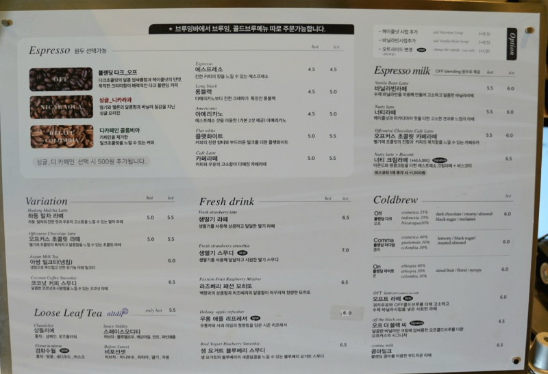 다양한 커피와 음료가 있는데, 에스프레소를 주문할 경우 원두를 고를 수 있습니다. 저야 세부적으로 고를 만큼 커피를 모르기에 그냥 아메리카노죠..