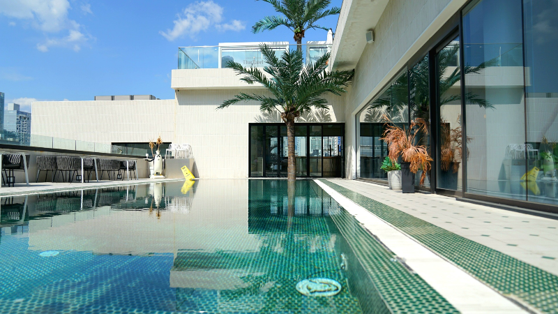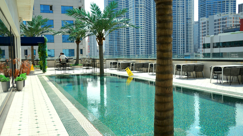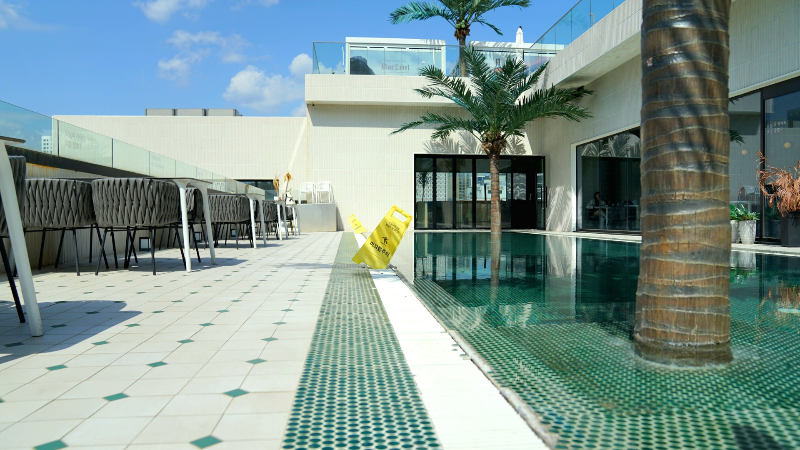 야외와 실내가 같이 있는 3층으로 갔어요 야외는 수영장이 있고 수영장을 따라 테이블이 있습니다.