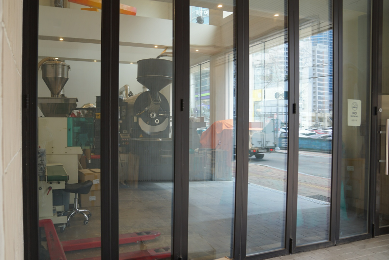 건물에 들어서면 카페 1층 매장 안, 커피 볶는 기계실이 창으로 보여요. 걸으면서 보면 뭔가 맛있는 커피를 맛볼 수 있을 기대감이 듭니다.